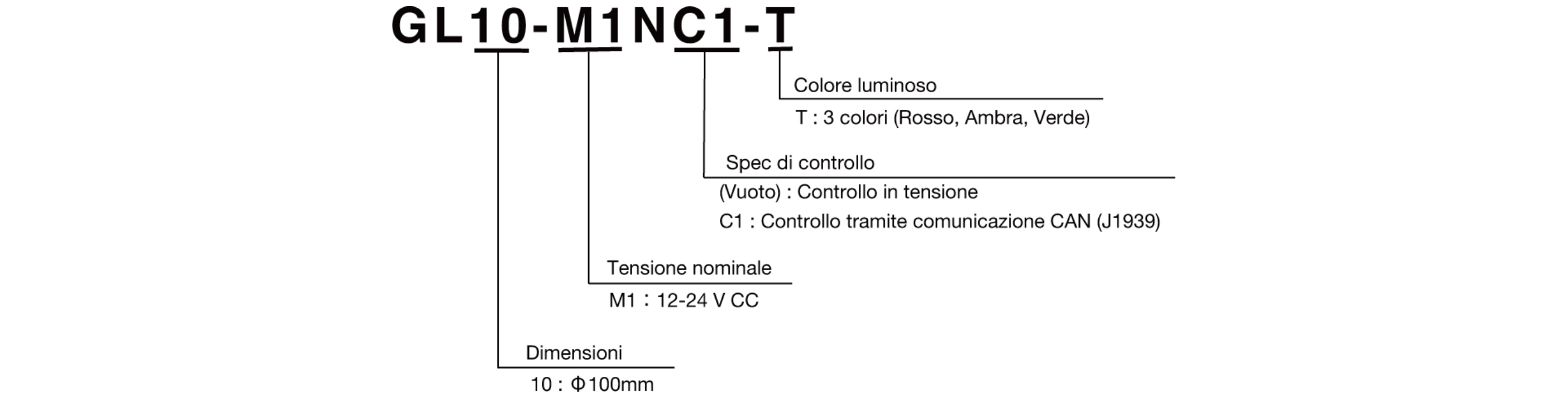| GL10-M1NC1-T | 12-24 V CC | 3 colori (Rosso, Ambra, Verde) |