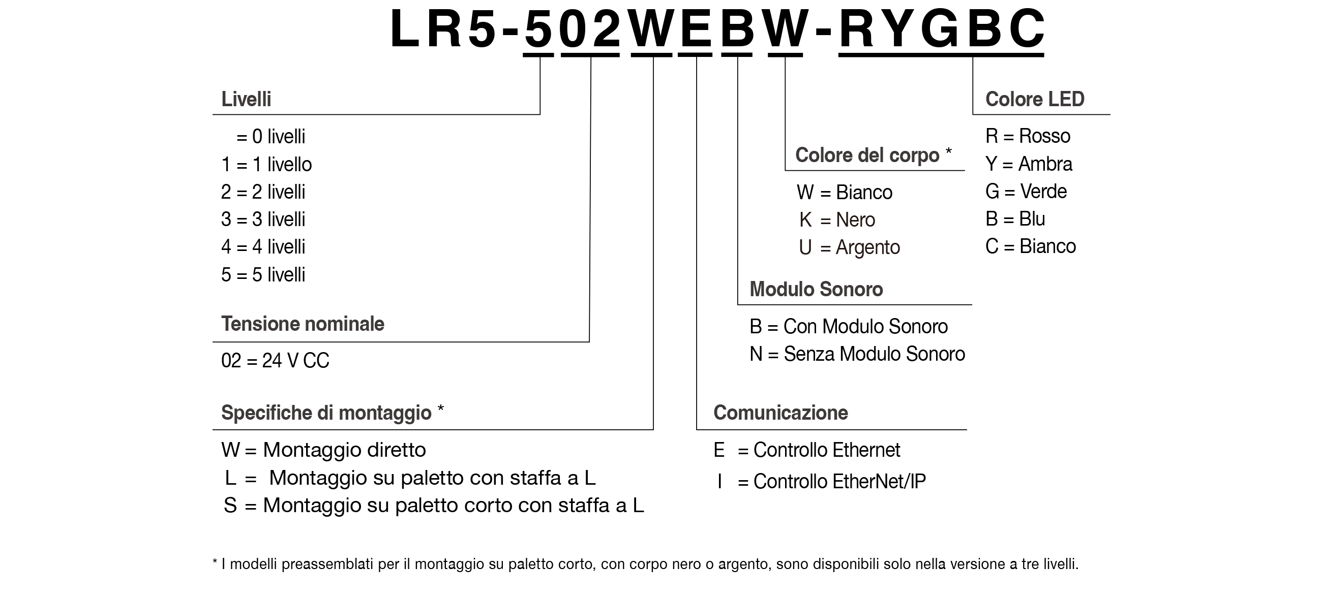 | LR5-302WEBK-RYG | 3 | 24 V CC | Montaggio diretto con fissaggio a 3 punti | Controllo Ethernet | Con Modulo Sonoro | Compatibile | Nero | Rosso, Ambra, Verde |