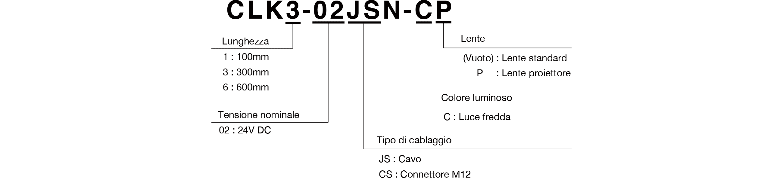 | CLK6-02CSN-C | 600mm | 24V DC | Connettore M12 (2 pin) | Luce fredda | Lente standard |